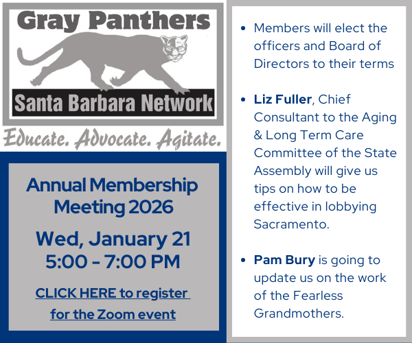 Join the Gray Panthers Santa Barbara Network for our 2026 Annual Membership Meeting! At the meeting, members will elect the officers for 2025 (Chair, Recording Secretary, Membership Secretary, and Treasurer) as well as about half of the Board of Directors for a two-year term. We welcome your input on issues you would like Gray Panthers to address in 2025. Please let us know your thoughts at: info@sbgraypanthers.org.
