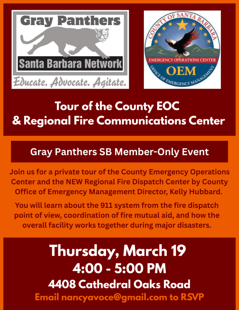 See below for the agenda for the meeting. We welcome your input on issues you would like Gray Panthers to address in the coming months. Please let us know your thoughts at: info@sbgraypanthers.org. Our policies can be found on our webpage: www.sbgraypanthers.org.